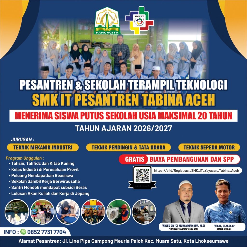 Menyongsong tahun ajaran baru, SMK IT Yayasan Tabina Aceh dengan bangga mengumumkan pembukaan Penerimaan Peserta Didik Baru (PPDB) untuk tahun 2026. Sebagai lembaga pendidikan yang berkomitmen mencetak generasi unggul, kami memegang teguh moto “Pendidikan Karakter dan Vokasi” sebagai fondasi utama…
